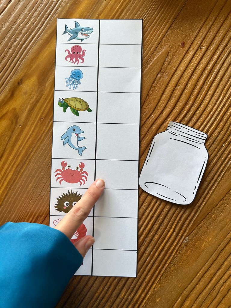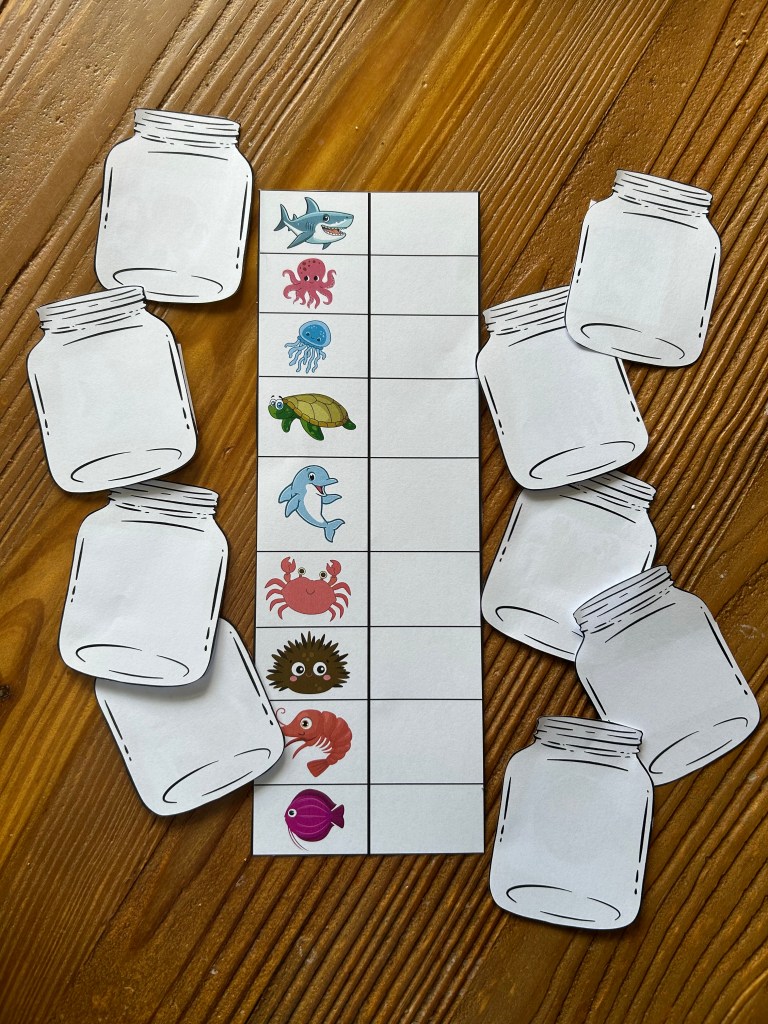 - Knip alle dierenplaatjes + ‘glazen potjes’ + afkruislijstjes uit en lamineer, zodat je het vaker kunt gebruiken. (Tip: print de ‘glazen potjes’ op dikker papier OF voeg een wit papiertje toe tussen het potje en het dier. Anders hoef je namelijk geen moeite meer te doen om te zien welk dier er verstopt zit).